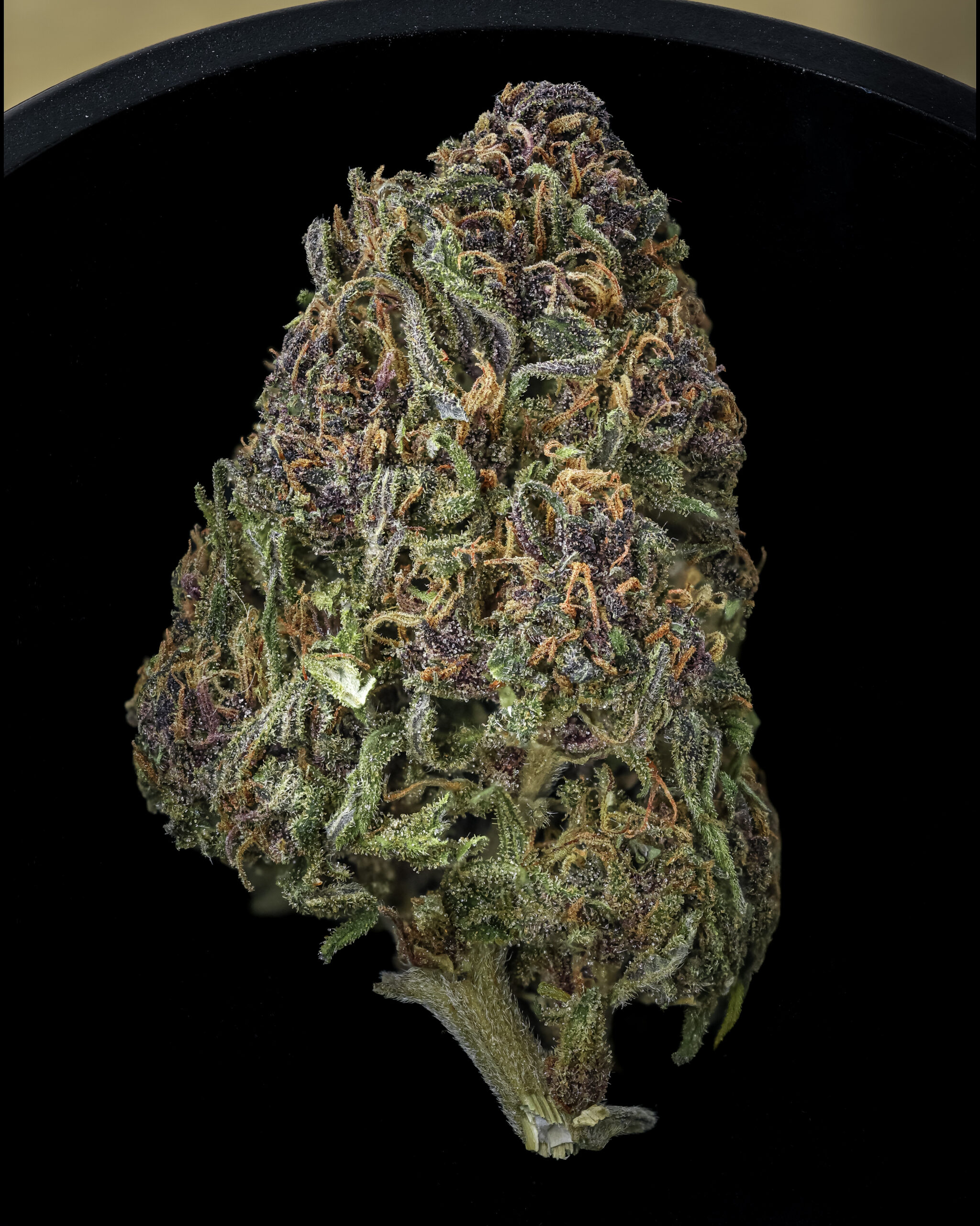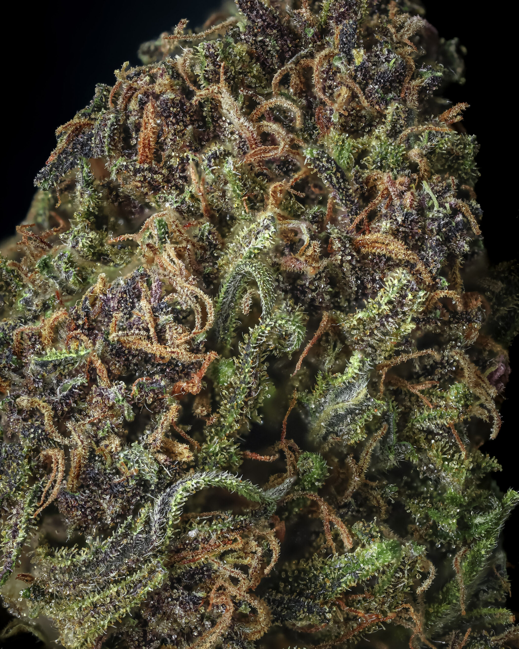 Fleurs denses recouverte de trichomes brillants, elle arbore des teintes rosées ou violettes.